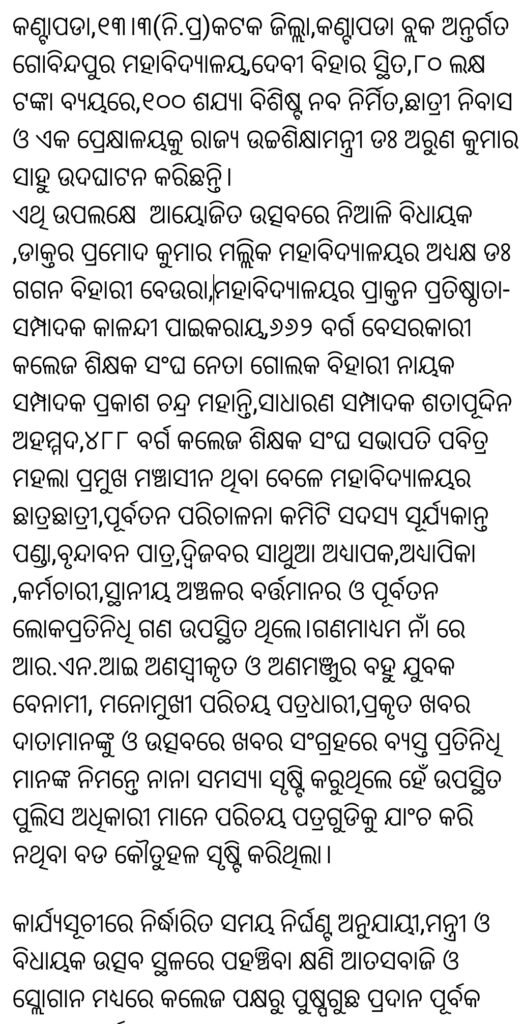 breaking News ଅଂଚଳ ଖବର ରାଜ୍ୟଖବର ଉଚ୍ଚଶିକ୍ଷା ମନ୍ତ୍ରୀଙ୍କ ଦ୍ୱାରା ୮୦ ଲକ୍ଷ ଟଙ୍କା ବ୍ୟୟରେ ନବ ନିର୍ମିତ ଛାତ୍ରୀନିବାସ ଓ ପ୍ରେକ୍ଷାଳୟ କୋଠା ଉଦଘାଟିତ March 14, 2021March 14, 2021satyanusandhanaLeave a Comment on ଉଚ୍ଚଶିକ୍ଷା ମନ୍ତ୍ରୀଙ୍କ ଦ୍ୱାରା ୮୦ ଲକ୍ଷ ଟଙ୍କା ବ୍ୟୟରେ ନବ ନିର୍ମିତ ଛାତ୍ରୀନିବାସ ଓ ପ୍ରେକ୍ଷାଳୟ କୋଠା ଉଦଘାଟିତ Spread the love ସ୍ୱାଧୀନତାର ୭୫ ବର୍ଷ ପରେ ସମାଜରେ ଆମେ ଭୟମୁକ୍ତ,ସୁରକ୍ଷିତ କି?କିଏ ନିଜ ଛାତିରେ ହାତ ରଖି କହିପାରିବ????
