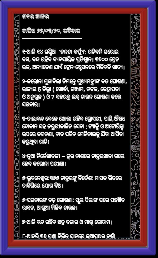 କେମିତି ଚାଲିଛି ଆମ ରାଜ୍ୟ ସ୍ୱାସ୍ଥ୍ୟ ସେବା?? Spread the loveSpread the loveଓଡ଼ିଶା ଲାଗି ଗର୍ବ,ଗୌରବର ଦିନ। ପ୍ରଧାନମନ୍ତ୍ରୀ ଶ୍ରୀ ନରେନ୍ଦ୍ର ମୋଦୀଙ୍କ […] June 20, 2025June 20, 2025satyanusandhanaLeave a Comment on କେମିତି ଚାଲିଛି ଆମ ରାଜ୍ୟ ସ୍ୱାସ୍ଥ୍ୟ ସେବା??