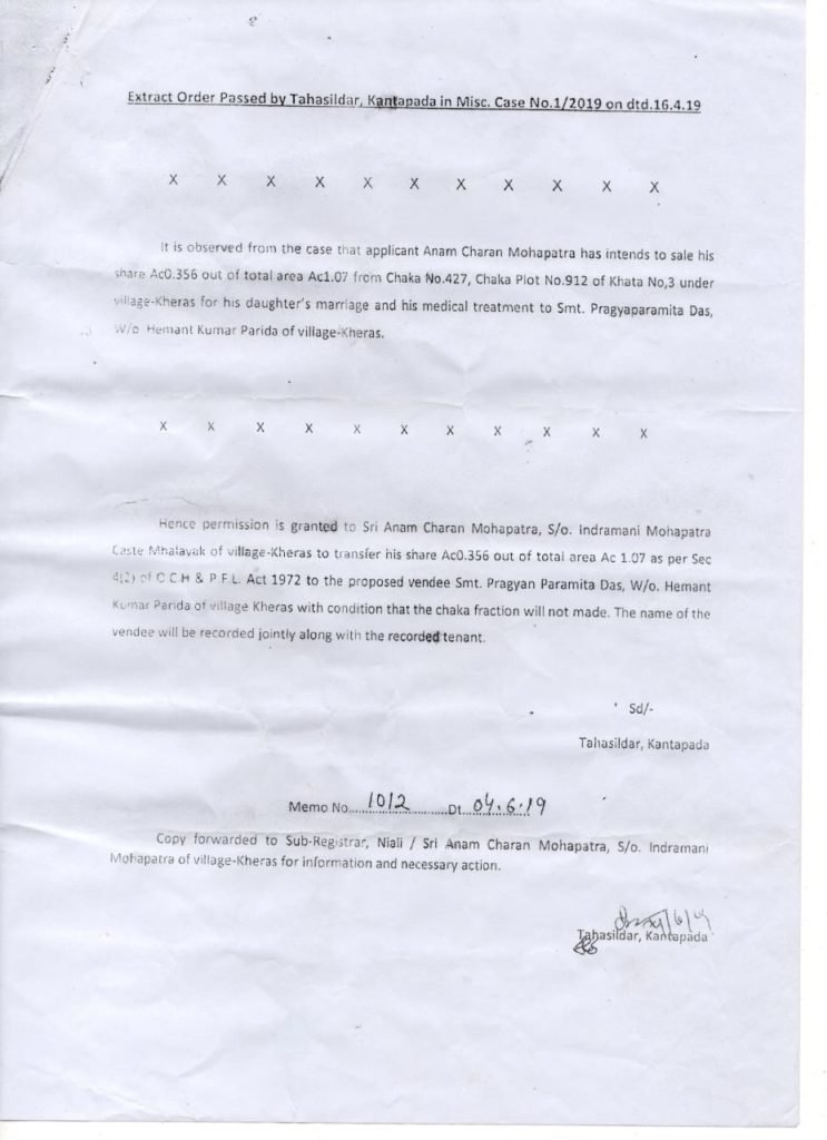କଟକ ୨୪।୯ ( ସ୍ୱ.ପ୍ର)- କଟକ ଜିଲ୍ଲାନ୍ତର୍ଗତ କଣ୍ଟାପଡା ତହସିଲ ର ତହସିଲଦାର ଆର୍ତ୍ତ ତ୍ରାଣ ମଲ୍ଲିକ ଓ ଜଗତସିଂହପୁର ଜିଲ୍ଲା ଆଳିପିଂଗଳ ଅଂଚଳର ଜଣେ ଅଂଗନୱାଡି କର୍ମୀକଂ ଜମିକିଣାବିକା ଜାଲିଆତି ଅଭିଯୋଗ କ୍ରାଇମବ୍ରାଂଚକୁ ସପ୍ରମାଣେ ଯାଇଥିବା ଜଣାପଡିଛି। ପ୍ରାପ୍ତ ସୂଚନାନୁଯାୟୀ ,କଟକ ଜିଲ୍ଲା କଣ୍ଟାପଡା ତହସିଲ ବ୍ରାହ୍ମଣସାଇଲୋ ରାଜସ୍ୱ ନିରୀକ୍ଷକକଂ ଅଧୀନରେ ଆସୁଥିବା ଖେରସ ଗ୍ରାମରେ ଖାତା ନମ୍ବର ୩ ଚକ ନଂ ୪୨୭, ପ୍ଲଟ୍ ନଂ ୯୧୨ ହାଡଗାଡିଆ,ସ୍ଥିତିବାନ, ୧ଏକର ୭ଡେଃ ର ଇଜିମାଲି ଚାଷଜମି ଚକରେ ରହିଛି। ଜମି କାଗଜାତ ଅନୁଯାୟୀ ୩ଜଣ ଅଂଶୀଦାର ଯଥା:ଅଚ୍ୟୁତାନନ୍ଦ ମହାପାତ୍ର,ଅବଧୂତ ମହାପାତ୍ର, ଅନାମ ଚରଣ ମହାପାତ୍ର ପିତା: ଇନ୍ଦ୍ରମଣିମହାପାତ୍ର ଅଟନ୍ତି । ଅଭିଯୋଗ ଅନୁଯାୟୀ ଅଚ୍ୟୁତା ନନ୍ଦକଂ ମ୍ରୁତ୍ୟୁ ୨।୧। ୨୦୧୩ ମସିହାରେ ହୋଇସାରିଛି।ଅବଧୂତକଂ ବିନା ଜାଣତରେ ଓ ଅଚ୍ୟୁତାନନ୍ଦକଂ ପ୍ରାୟ ୭ବର୍ଷ ତଳେ ହୋଇସାରିଥିବା ମ୍ରୁତ୍ୟୁକୁ ଚପାଇରଖି ଅନାମ ଚରଣ ମହାପାତ୍ର ନିଆଳି ସବ ରେଜିଷ୍ଟରକଂ ନିକଟରେ ବଣ୍ଟନ ହୋଇନ ଥିବା ଓ ଅଂଶ ସାବ୍ୟସ୍ତ ହୋଇ ନ ଥିବା, ଫଳରେ ଚଉହଦି ସ୍ଥିର ନ ଥିବା ଜମିର କିଛି ଅଂଶକୁ ପ୍ରଜ୍ଞାପାରମିତା ଦାସ ନାମକ ଜଣେ ମହିଳାକୁଂ ବିକ୍ରିଖର୍ଦ୍ଦି କବଲାରେ ଦେଇଛନ୍ତି। ଶ୍ରୀମତି ଦାସ ଜଗତସିଂହପୁର ଜିଲ୍ଲା,ଆଳିପିଂଗଳ ଜେଲପାଖ କେଉଁ ଏକ ଗାଁ ରେ ଅଂଗନୱାଡିରେ କର୍ମୀ ଅଛନ୍ତି। ଜମି କିଣାବିକା ଆଗରୁ ସେ ସରକାରକଂ ଠାରୁ ଥିବା ନିୟମାନୁଯାୟୀ ଆଗୁଆ ଅନୁମତି ନେଇଛନ୍ତି କି ନା ତାହା ଜଣାପଡିନାହିଁ, ଯାହା ତଦନ୍ତ ପରେ ସ୍ପଷ୍ଟ ହେବ।ଲୁଚା ଛପାରେ ଚାଲିଥିବା ଘଟଣା ସଂପର୍କରେ ସୁରାକ ବାରି ଅବଧୂତକଂ ପରିବାର ଏପରି ବେଆଇନ କିଣା ଜମିର ମ୍ୟୁଟେସନ ନ କରିବାକୁ କଣ୍ଟାପଡା ତହସିଲଦାର ଆର୍ତ୍ତତ୍ରାଣ ମଲ୍ଲୀକ କୁଂ ସମସ୍ତ ଘଟଣା ଲିଖିତ ଭାବେ ଜଣାଇଥିଲେ ହେଁ ସେ ଆବେଦନ ଗ୍ରହଣ ନ କରି ଫେରାଇଦେଇଥିଲେ।ଫଳରେ ନିଜର ଭାତହାଣ୍ଡି ନିଜ ଆଖି ଆଗରେ ଚାଲିଯାଉଥିବା ଦେଖି,ଅବଧୂତ ଓ ତାଂକ ପିଲାମାନେ କ୍ରାଇମବ୍ରାଂଚ ଅତିରିକ୍ତ ମହାନିର୍ଦ୍ଦେଶକକଂ ଦ୍ୱାରସ୍ଥ ହୋଇଛନ୍ତି । ଆମେ ଏ ସଂପର୍କରେ ତହସିଲଦାର ଆର୍ତ୍ତ ତ୍ରାଣ ମଲ୍ଲିକ କଂ ମତାମତ ଜାଣିବାକୁ ଚାହିଁଥିଲୁ ସେ” ଜଣେ ଅଂଶୀଦାର ମ୍ରୁତ ଥିବା ଜାଣି ନଥିଲେ ବୋଲି କହିବା ସହ ଅନ୍ୟଜଣେ ଦାଖଲ ଖାରଜ ନୋଟିସ ପାଇଥିବା ,ଆର.ଆଇ ମ୍ୟୁଟେସନ କରନ୍ତି ତେବେ ଚକରେ ଥିବା ଜମି ଚକ ଭଂଗାଯିବ ନାହିଁ କେବଳ ଜଣେମାଲିକକଂ ବଦଳରେ ନୂଆ କ୍ରେତାକଂ ନାମ ଦରଜ ହେବଏମିତିକା ହଜାର କେଶଅଛି” ବୋଲି କହିଥିଲେ।ତେବେ କାହାର କେଉଁଠୁ ବୋଲି ଜଣାପଡିବ କେମିତି ? ଯଦି ଦଖଲ ନେବାକୁ କେନ୍ଦ୍ରକରି ଆଇନ ଶ୍ରୁଂଖଳା ପରିସ୍ଥିତି ଉପୁଜେ କିଏ ଦାୟୀହେବ ? ପ୍ରସଂଗରେ କୌଣସି ସନ୍ତୋଷଜନକ ଉତ୍ତର ଦେଇ ନପାରି ନୀରବ ହୋଇଯାଇ ଥିଲେ। ତେବେ ଆମେ ମ୍ରତବ୍ୟକ୍ତିକ ମ୍ରୁତ୍ୟୁର ପ୍ରମାଣପତ୍ର ଓ ଅନ୍ୟକାଗଜାତ ପ୍ରମାଣ ପାଠକକଂ ଅବଗତି ତଥା ସନ୍ଦେହମୋଚନ ନିମିତ୍ତ ଏଠାରେଉପସ୍ଥାପିତ କରୁଛୁ।