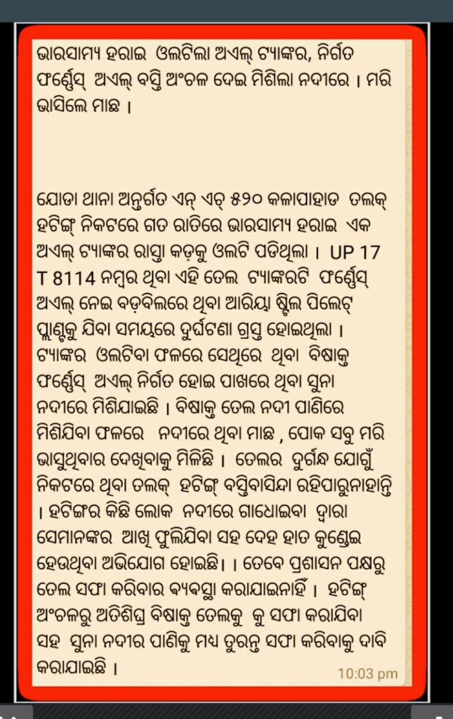 ଦୁର୍ଘଟଣା ଦୁର୍ଘଟଣା ଗ୍ରସ୍ତ ଟ୍ୟାଂକରରୁ ଫର୍ଣେସ ତେଲ ମିଶିଲା ନଦୀରେ;ମାଛ ସମେତ ଅନ୍ୟାନ୍ୟ ଜଳଚର ଜୀବ ମଲେ! July 5, 2020July 5, 2020satyanusandhanaLeave a Comment on ଦୁର୍ଘଟଣା ଗ୍ରସ୍ତ ଟ୍ୟାଂକରରୁ ଫର୍ଣେସ ତେଲ ମିଶିଲା ନଦୀରେ;ମାଛ ସମେତ ଅନ୍ୟାନ୍ୟ ଜଳଚର ଜୀବ ମଲେ! Spread the love