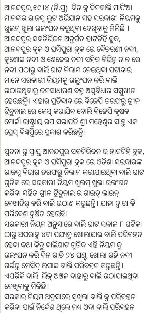 ଜିଲ୍ଲାଖବର ଦୁର୍ନିତି ବେଆଇନ ନଦୀ ବାଲି ଲୁଟୁଛନ୍ତି ମାଫିଆ! April 19, 2021April 19, 2021satyanusandhanaLeave a Comment on ବେଆଇନ ନଦୀ ବାଲି ଲୁଟୁଛନ୍ତି ମାଫିଆ! Spread the love