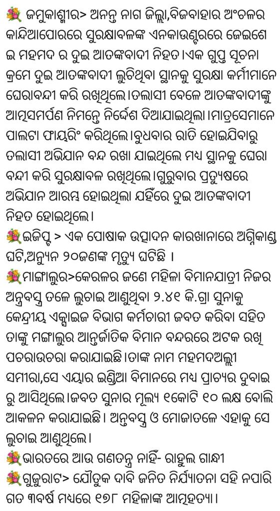 ପୂର୍ଣ୍ଣ ସଂଖ୍ୟାଗରିଷ୍ଠତା ପଥରେ କେନ୍ଦ୍ରରେ ଆଉଥରେ ମୋଦୀ ସରକାର!! Spread the loveSpread the loveବ୍ୟୁରୋ ନିଉଜ,୨୫/୦୫ ସାଧାରଣ ନିର୍ବାଚନର ଅନ୍ତିମଚରଣ କେବଳ ଏବେବାକି,ସମସ୍ତଙ୍କ ମନରେ […] May 25, 2024June 2, 2024satyanusandhanaLeave a Comment on ପୂର୍ଣ୍ଣ ସଂଖ୍ୟାଗରିଷ୍ଠତା ପଥରେ କେନ୍ଦ୍ରରେ ଆଉଥରେ ମୋଦୀ ସରକାର!!
