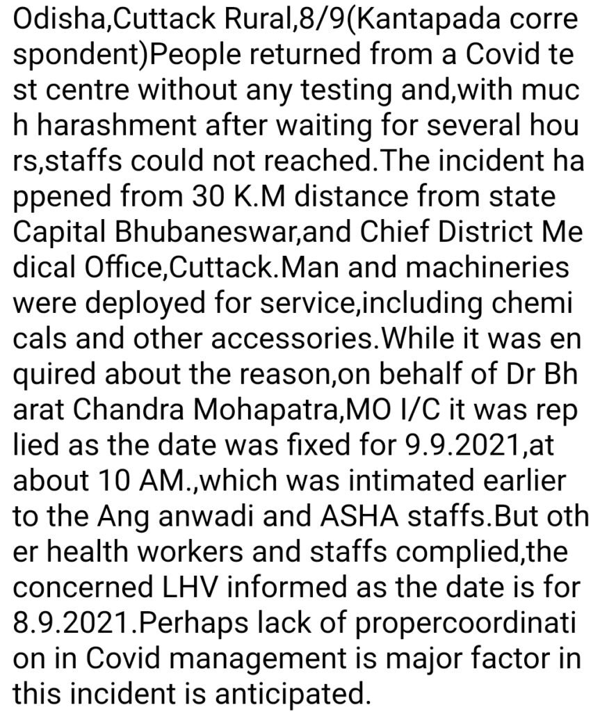 Health ଦୁର୍ନିତି ରାଜ୍ୟଖବର Odisha:Harashed people returned from a Covid test centre,as staff did not reached September 9, 2021September 9, 2021satyanusandhanaLeave a Comment on Odisha:Harashed people returned from a Covid test centre,as staff did not reached Spread the love