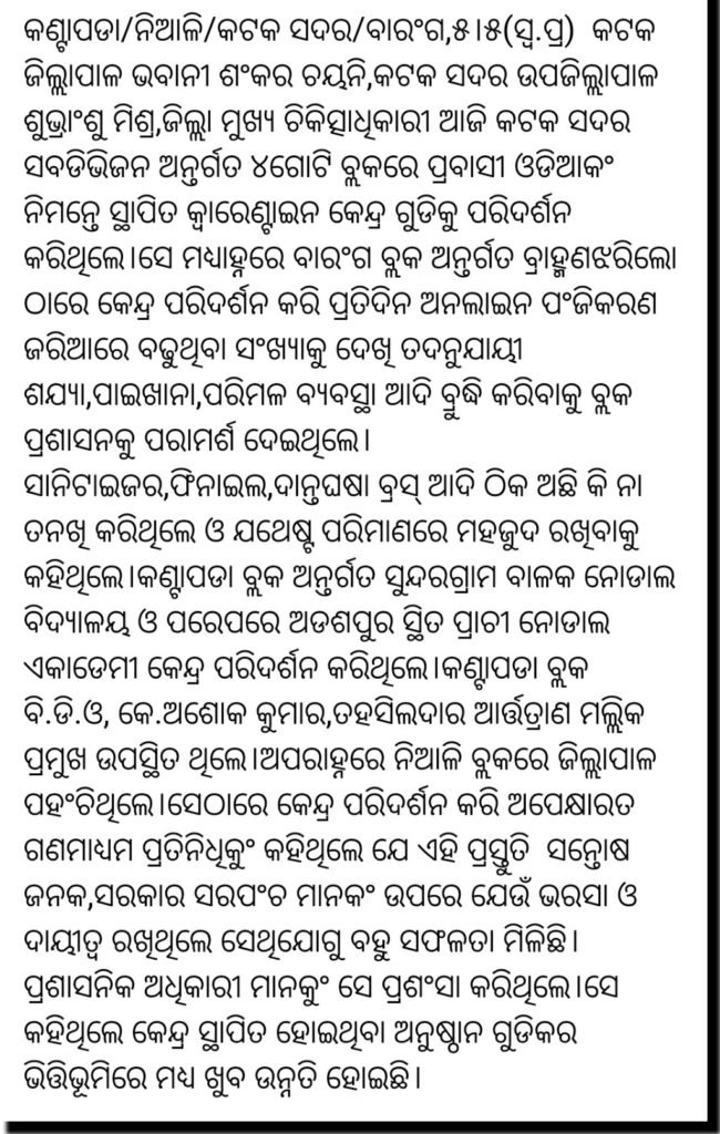 breaking News ରାଜ୍ୟଖବର (State):କଟକ-(ଜିଲ୍ଲାପାଳକଂ କ୍ୱାରେଣ୍ଟାଇନ କେନ୍ଦ୍ର ପରିଦର୍ଶନ),ଯାଜପୁର- ବିନା ସଂଗରୋଧରେ ବହିବଣ୍ଟନ,ଖୋର୍ଦ୍ଧା-ମହୁମାଛି ଆକ୍ରମଣରେ ଚାଷୀଗୁରୁତର,କେନ୍ଦୁଝର-(ମହିଳାକଂଆତ୍ମହତ୍ୟା,ଟଳିପଡିଲେ କରୋନା ଯୋଦ୍ଧା)….. May 5, 2020May 5, 2020satyanusandhanaLeave a Comment on (State):କଟକ-(ଜିଲ୍ଲାପାଳକଂ କ୍ୱାରେଣ୍ଟାଇନ କେନ୍ଦ୍ର ପରିଦର୍ଶନ),ଯାଜପୁର- ବିନା ସଂଗରୋଧରେ ବହିବଣ୍ଟନ,ଖୋର୍ଦ୍ଧା-ମହୁମାଛି ଆକ୍ରମଣରେ ଚାଷୀଗୁରୁତର,କେନ୍ଦୁଝର-(ମହିଳାକଂଆତ୍ମହତ୍ୟା,ଟଳିପଡିଲେ କରୋନା ଯୋଦ୍ଧା)….. Spread the love